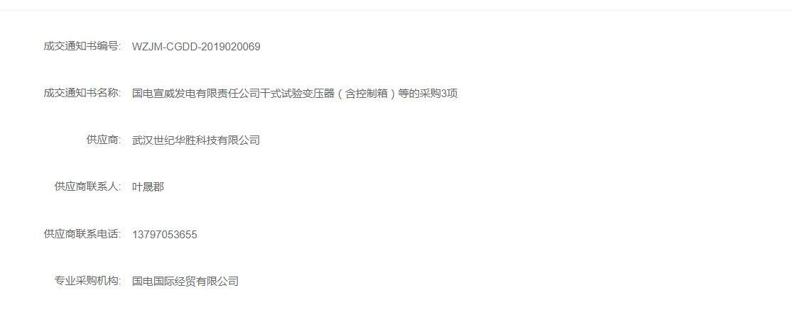 熱烈祝賀:武漢世紀(jì)華勝在國(guó)電宣威發(fā)電有限責(zé)任公司干式試驗(yàn)變壓器(含控制箱)等的采購(gòu)3項(xiàng)中中標(biāo)