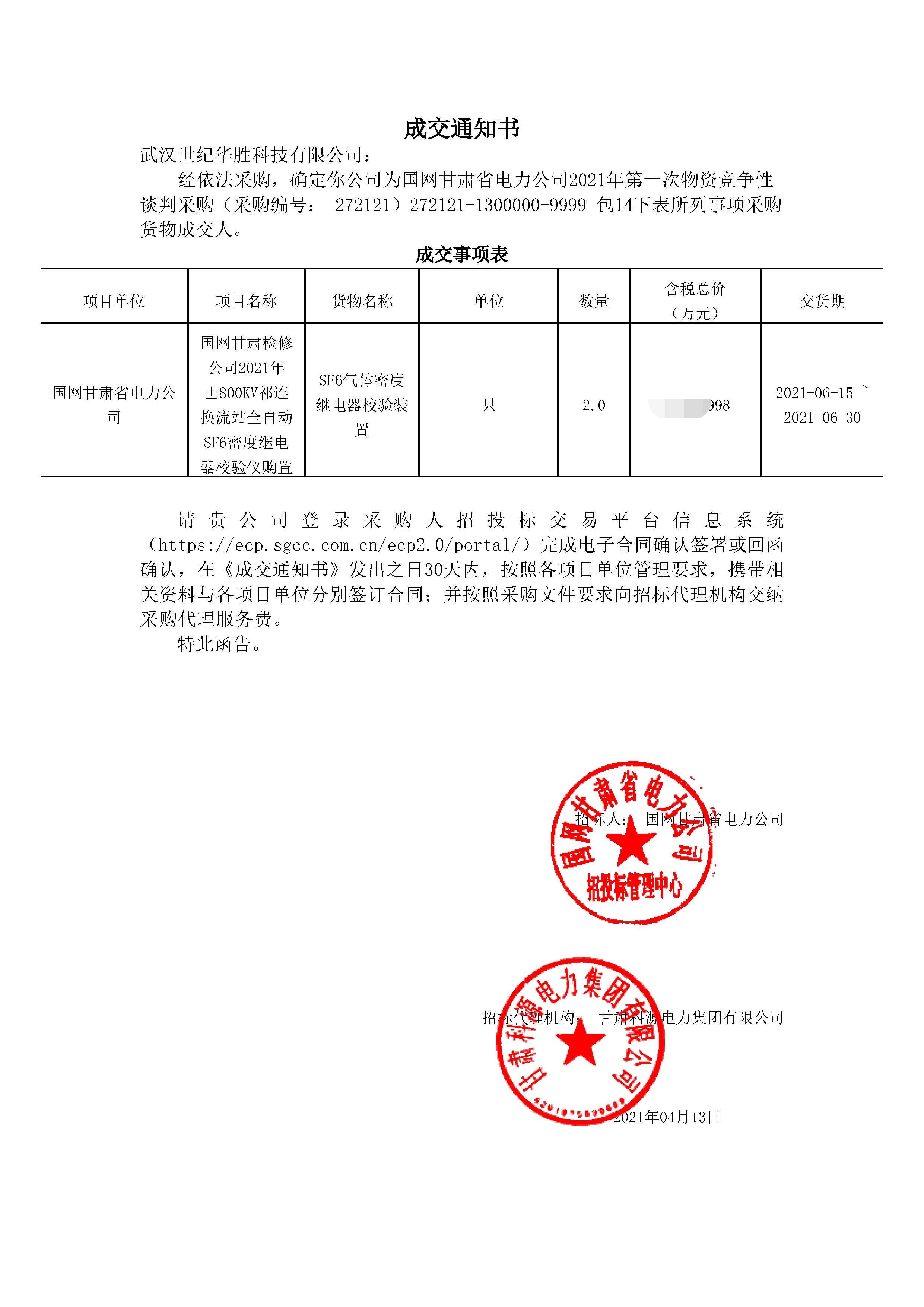 熱烈祝賀武漢世紀(jì)華勝科技有限公司在國網(wǎng)甘肅省電力公司2021年第一-次物資競爭性 談判采購項(xiàng)目中中標(biāo)