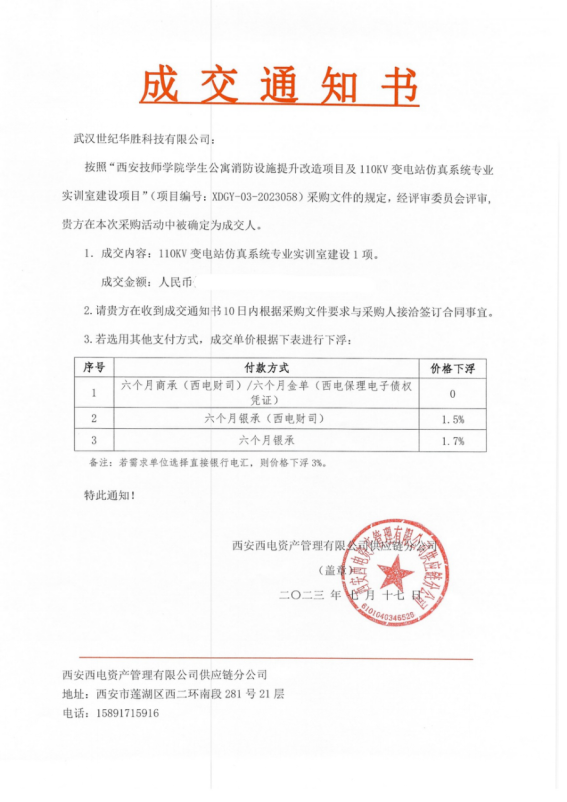 熱烈慶祝武漢世紀(jì)華勝科技有限公司在西安技師學(xué)院學(xué)生公寓消防設(shè)施提升改造項(xiàng)目及110KV變電站仿真系統(tǒng)專業(yè)實(shí)訓(xùn)室建設(shè)項(xiàng)目圓滿結(jié)束