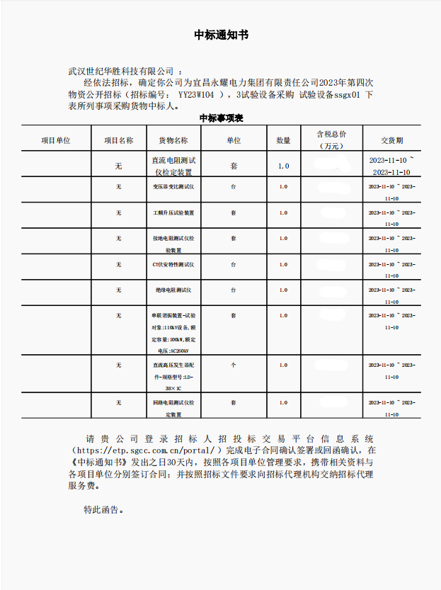 熱烈慶祝武漢世紀(jì)華勝科技有限公司在宜昌永耀電力集團(tuán)有限責(zé)任公司2023年第四次物資公開招標(biāo)項目中標(biāo)
